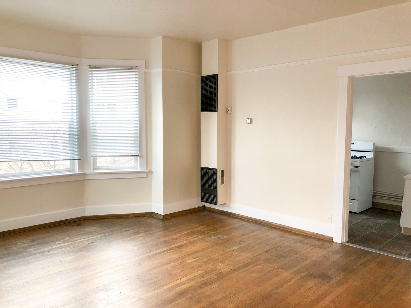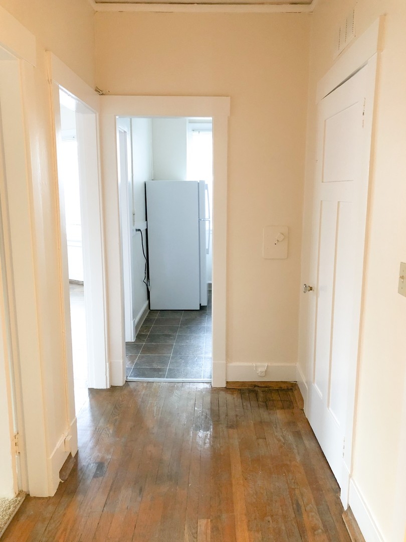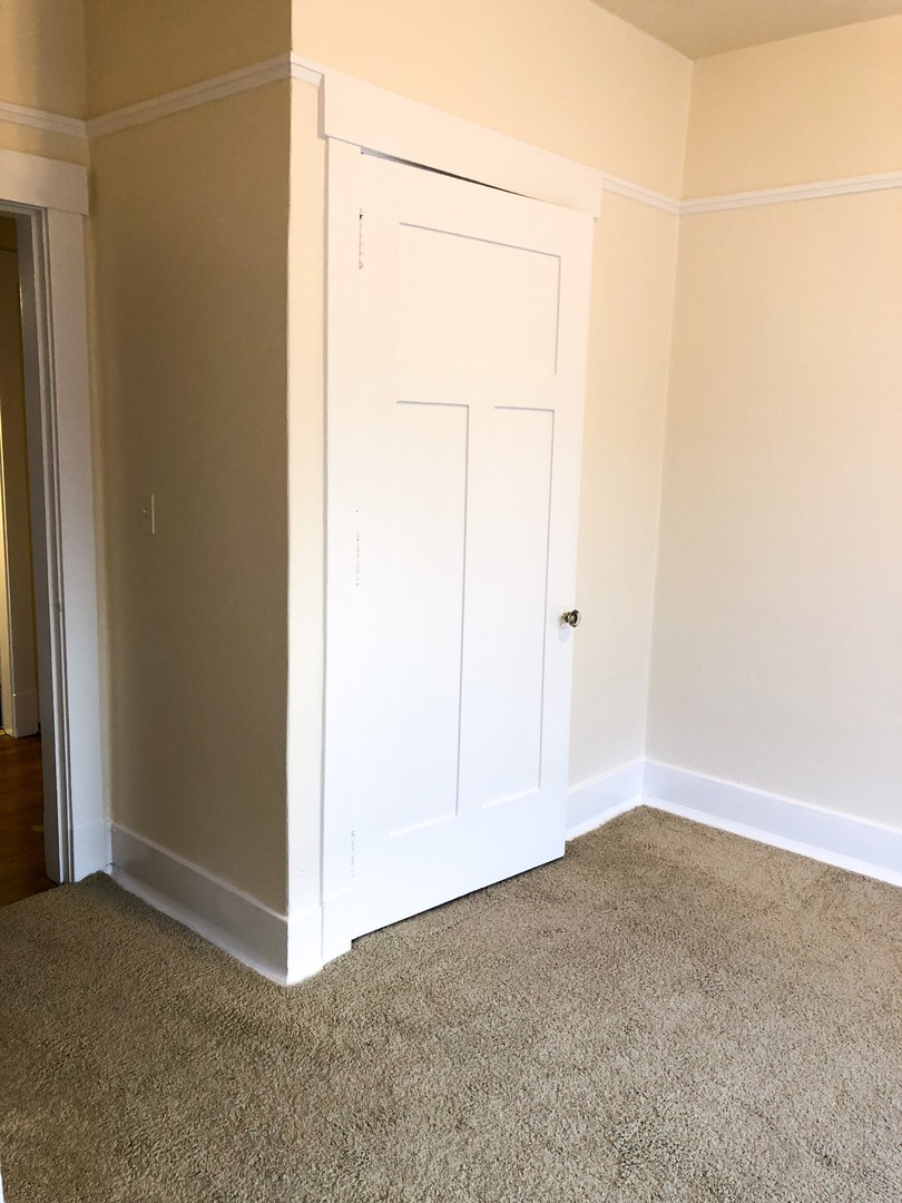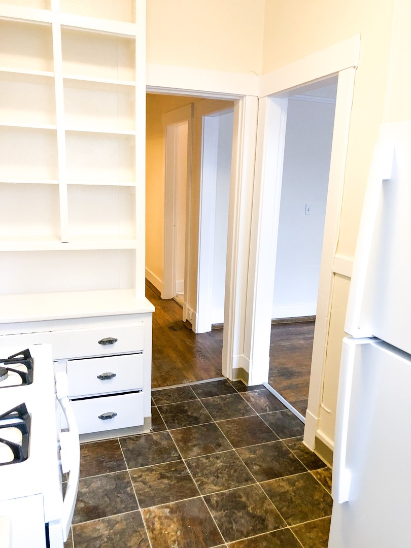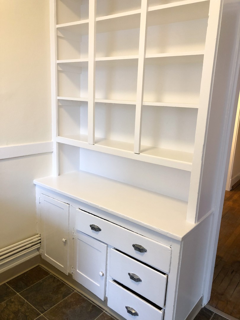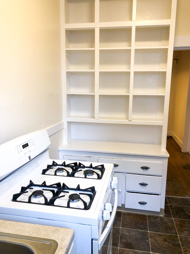 This unique 1 bedroom features original hardwood floors and vintage fixatures including a built in China cabinet with buffet. Beautiful bay windows invite in natural light while the 10 ft ceilings open up this classic space. Pocket doors separate the large bedroom (14x9). Two walk in closets provide plenty of storage.