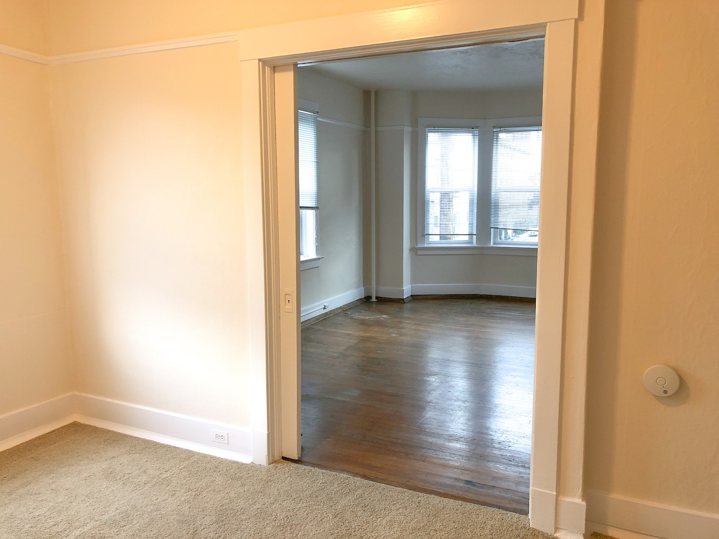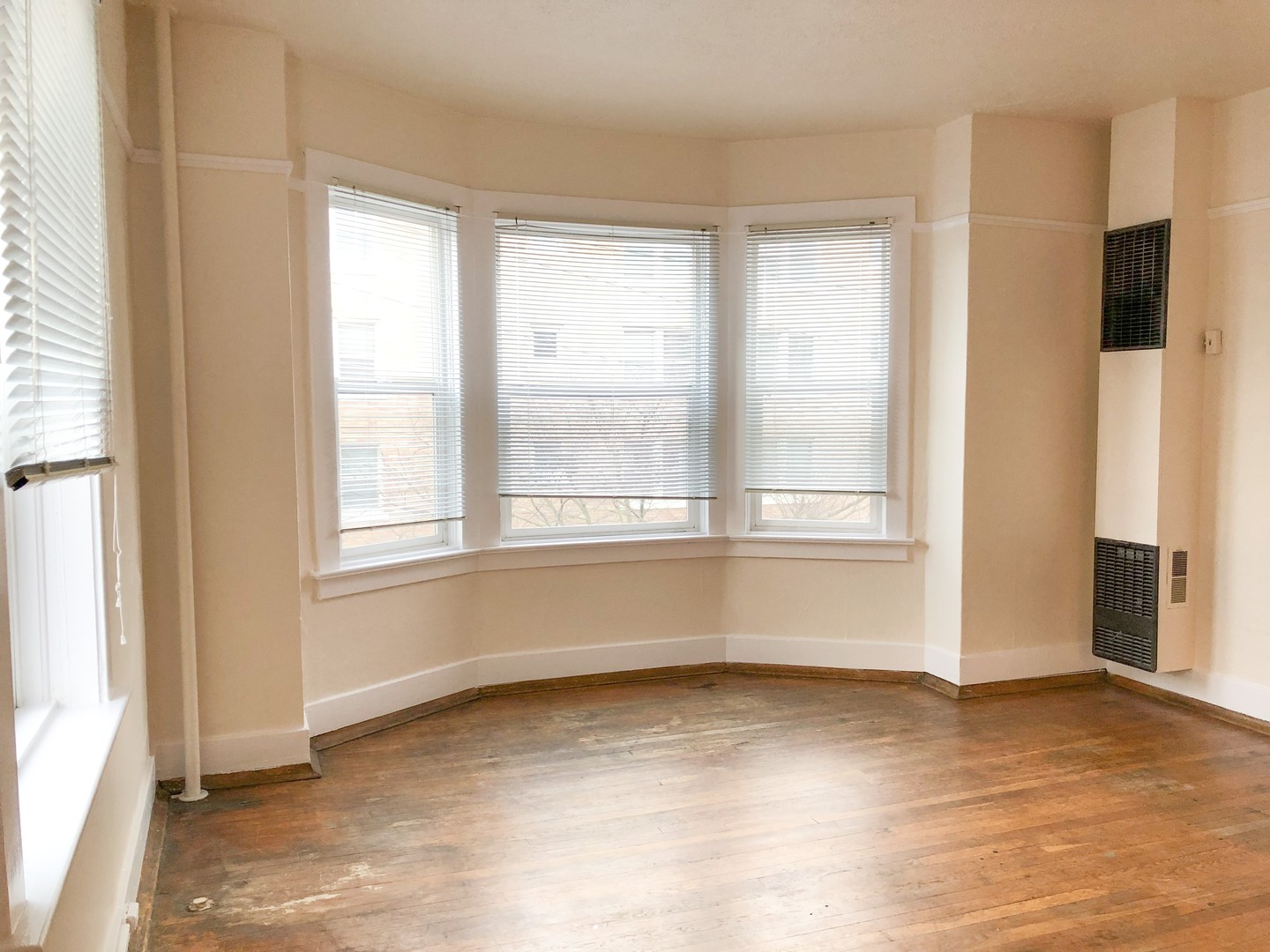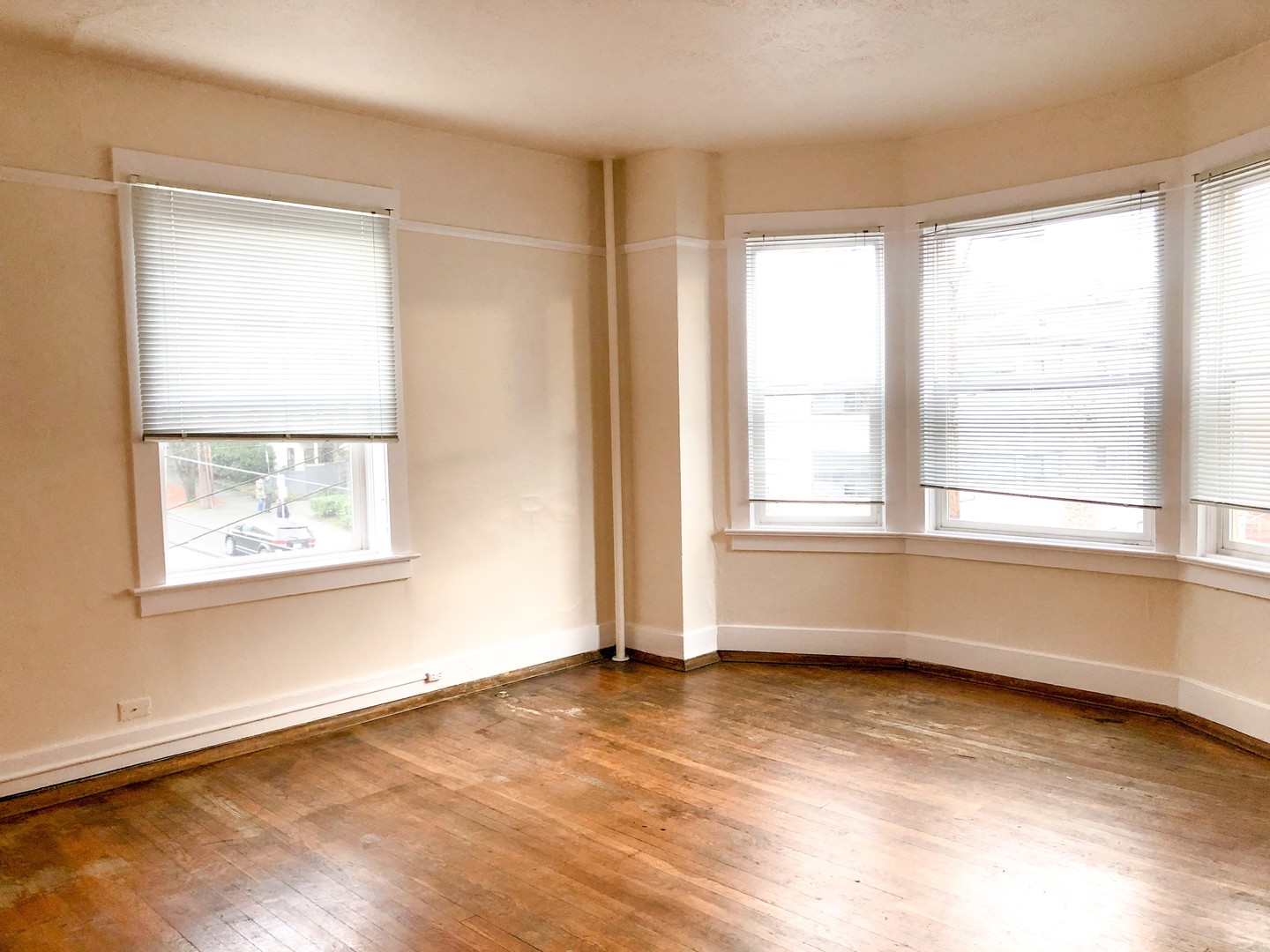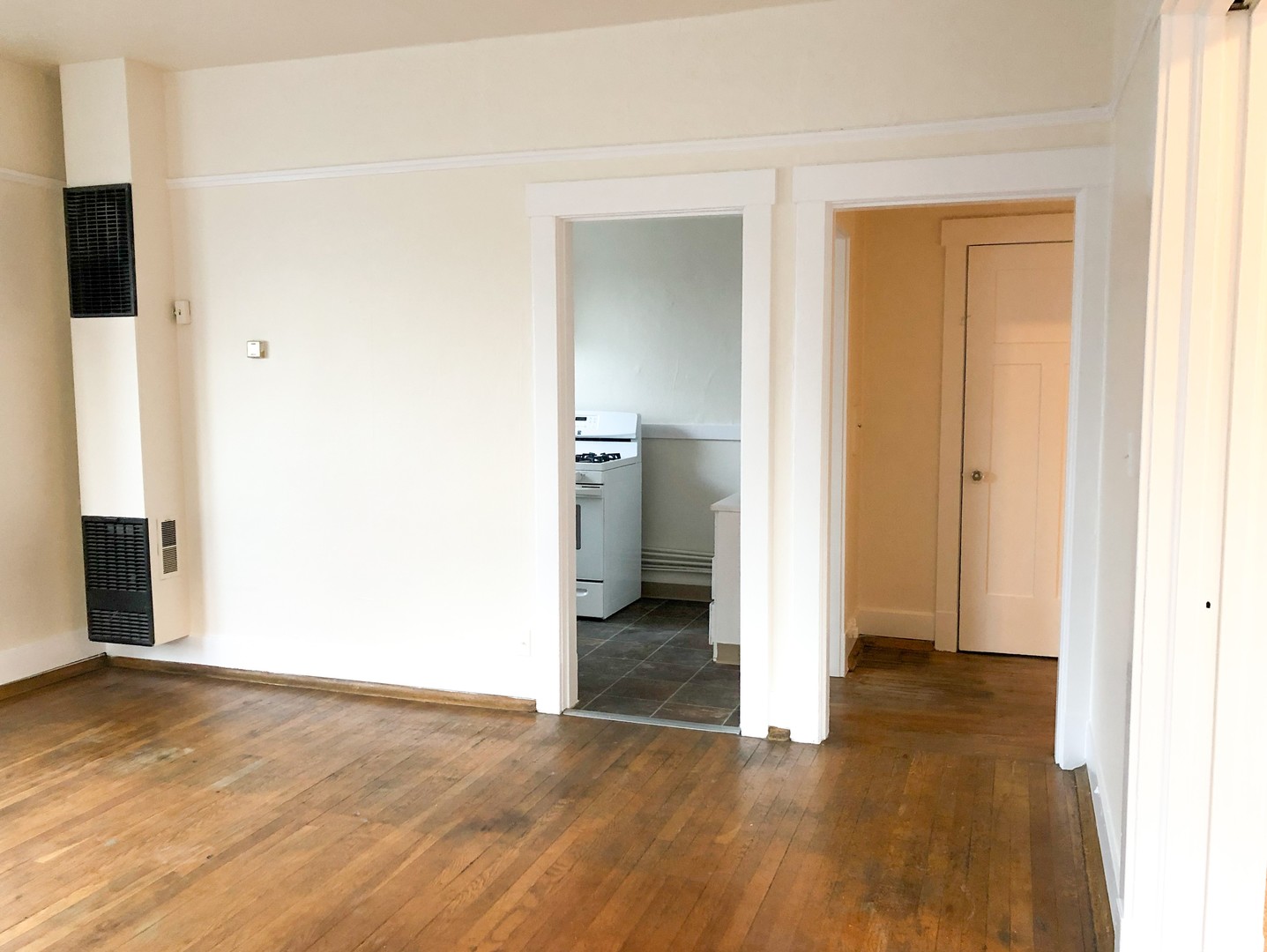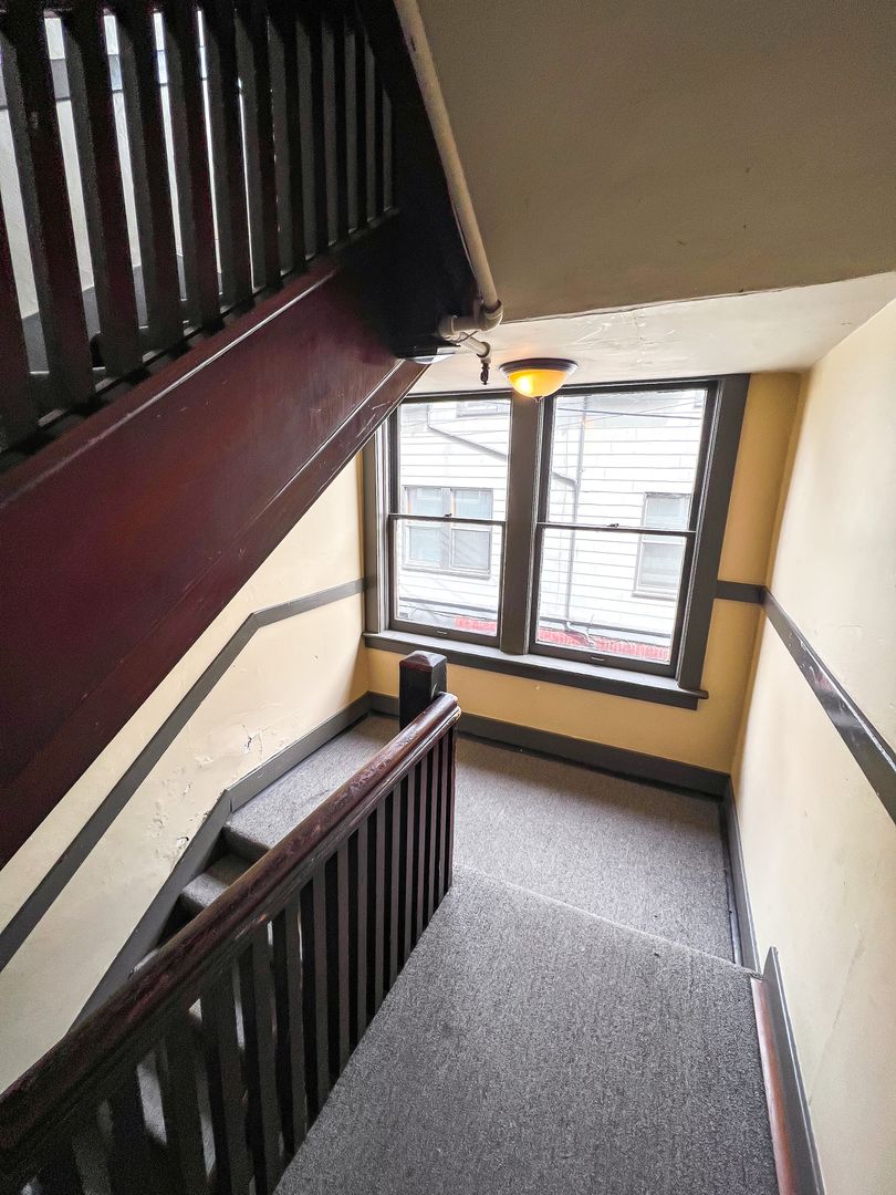 This unique 1 bedroom features original hardwood floors and vintage fixatures including a built in China cabinet with buffet. Beautiful bay windows invite in natural light while the 10 ft ceilings open up this classic space. Pocket doors separate the large bedroom (14x9). Two walk in closets provide plenty of storage.