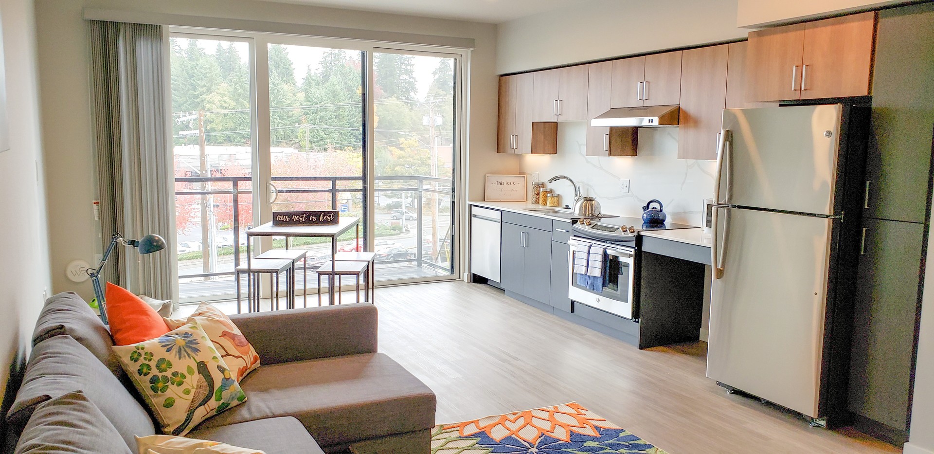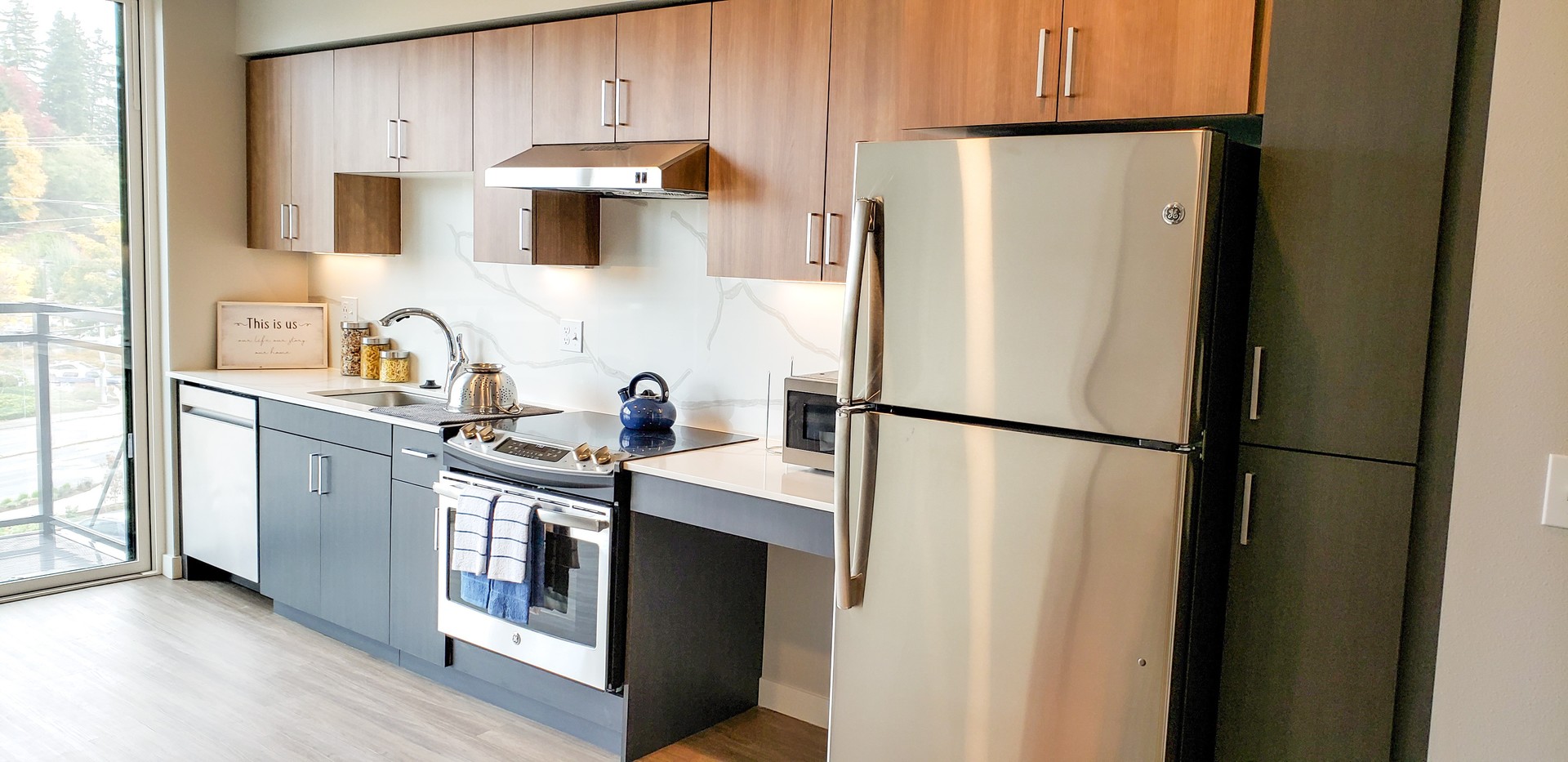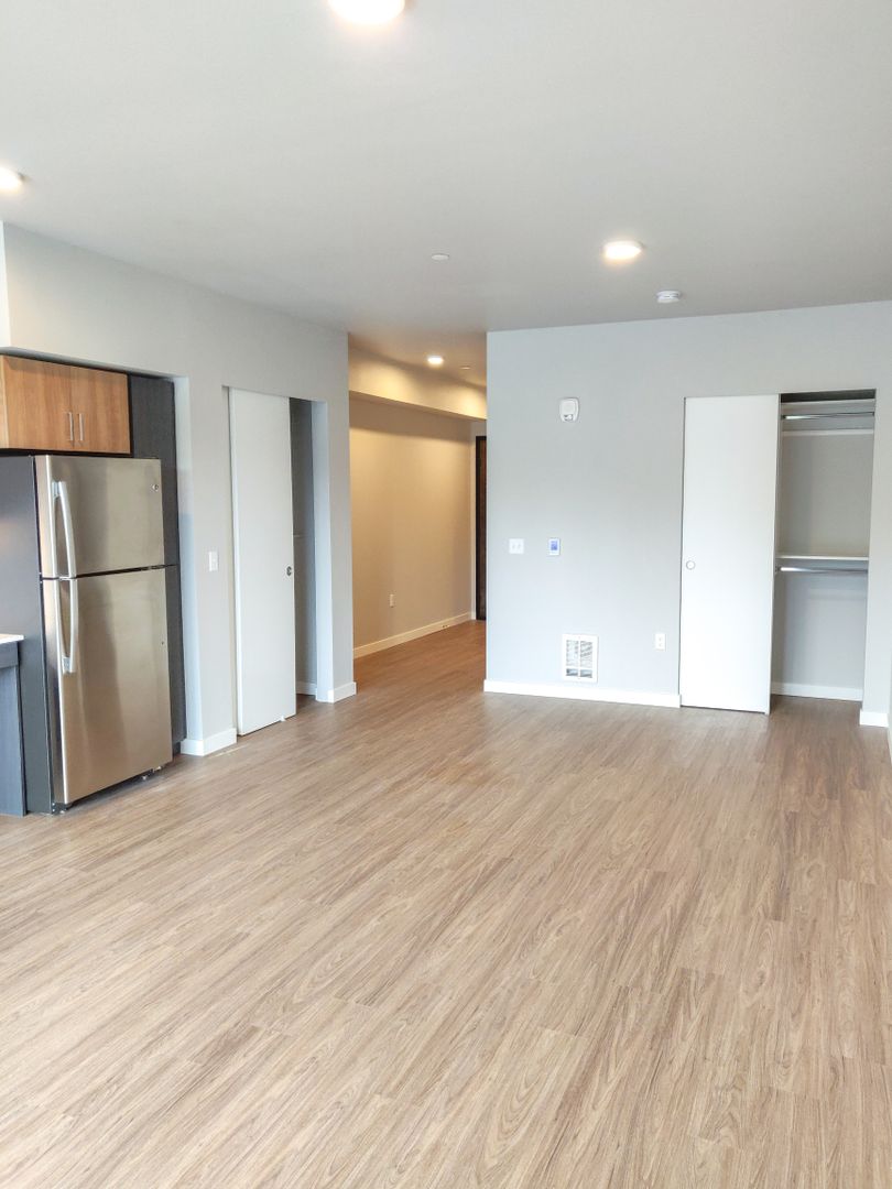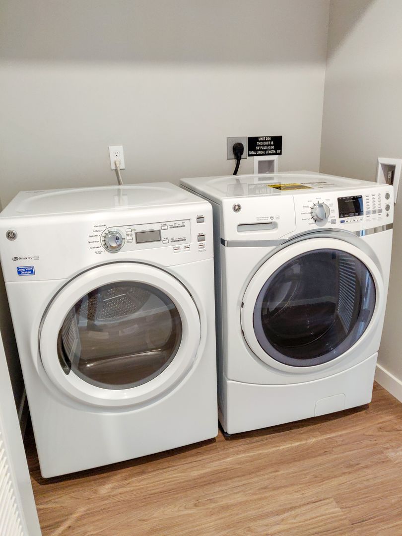 Step into our distinctive apartments, characterized by large floor-to-ceiling windows that bathe your space in natural light. Enjoy the convenience of high-efficiency stainless steel appliances, elegantly designed slab quartz countertops with complementary backsplash, air-conditioning wall ports, and smart lock keyless entry. Inside, you'll find full-sized washers and dryers for added convenience, spacious covered balconies for relaxation, and luxurious vinyl flooring that graces your living areas!