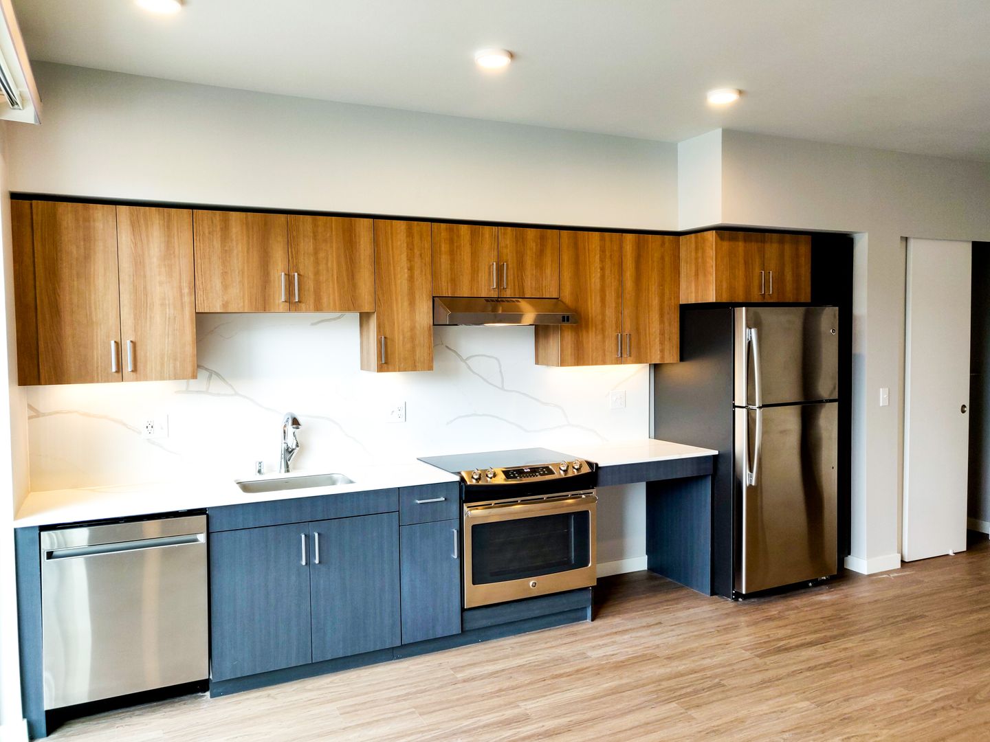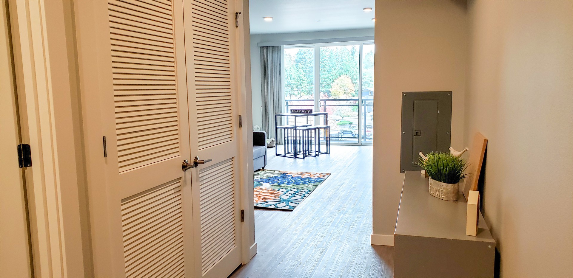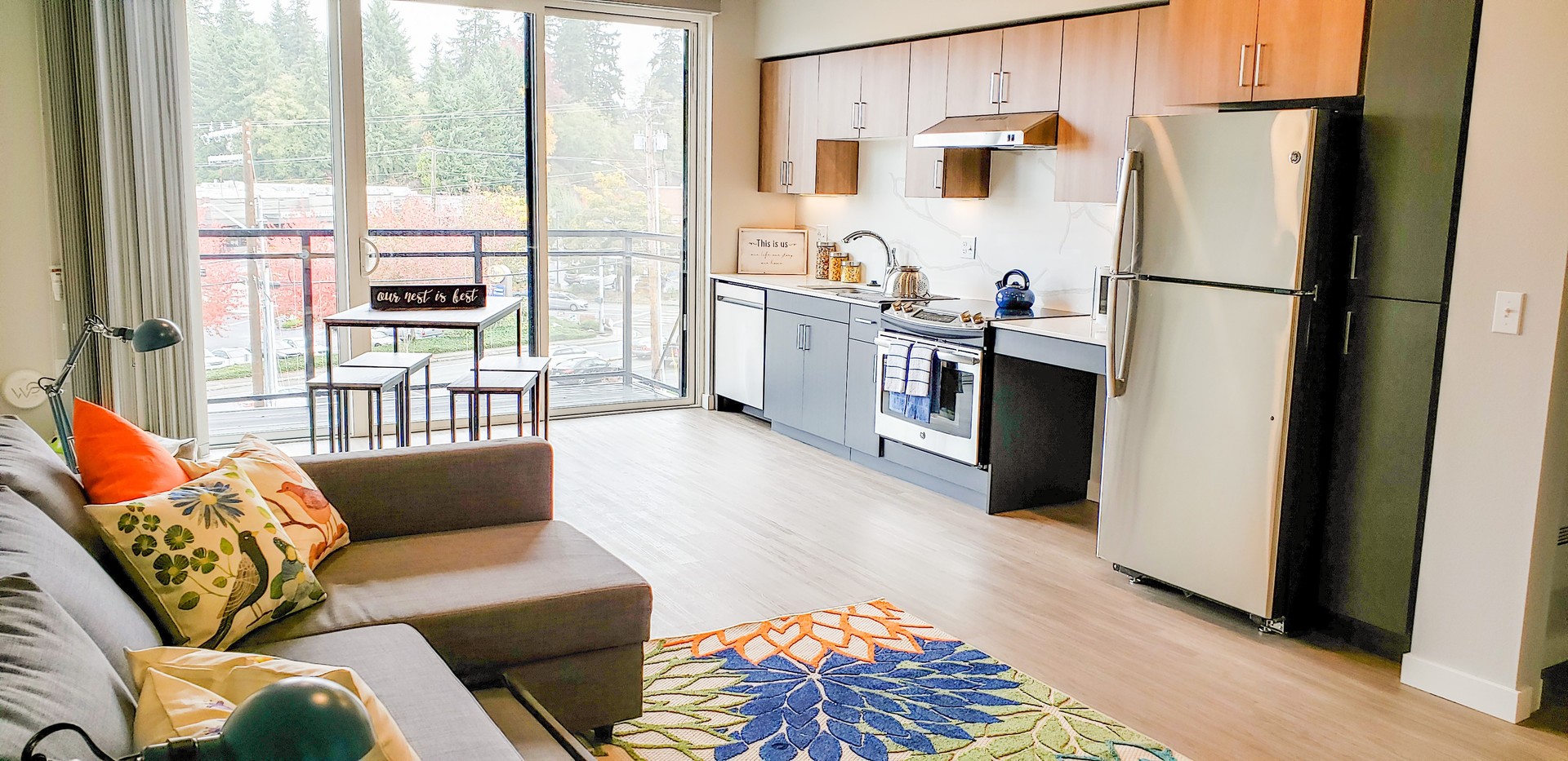 Step into our distinctive apartments, characterized by large floor-to-ceiling windows that bathe your space in natural light. Enjoy the convenience of high-efficiency stainless steel appliances, elegantly designed slab quartz countertops with complementary backsplash, air-conditioning wall ports, and smart lock keyless entry. Inside, you'll find full-sized washers and dryers for added convenience, spacious covered balconies for relaxation, and luxurious vinyl flooring that graces your living areas!